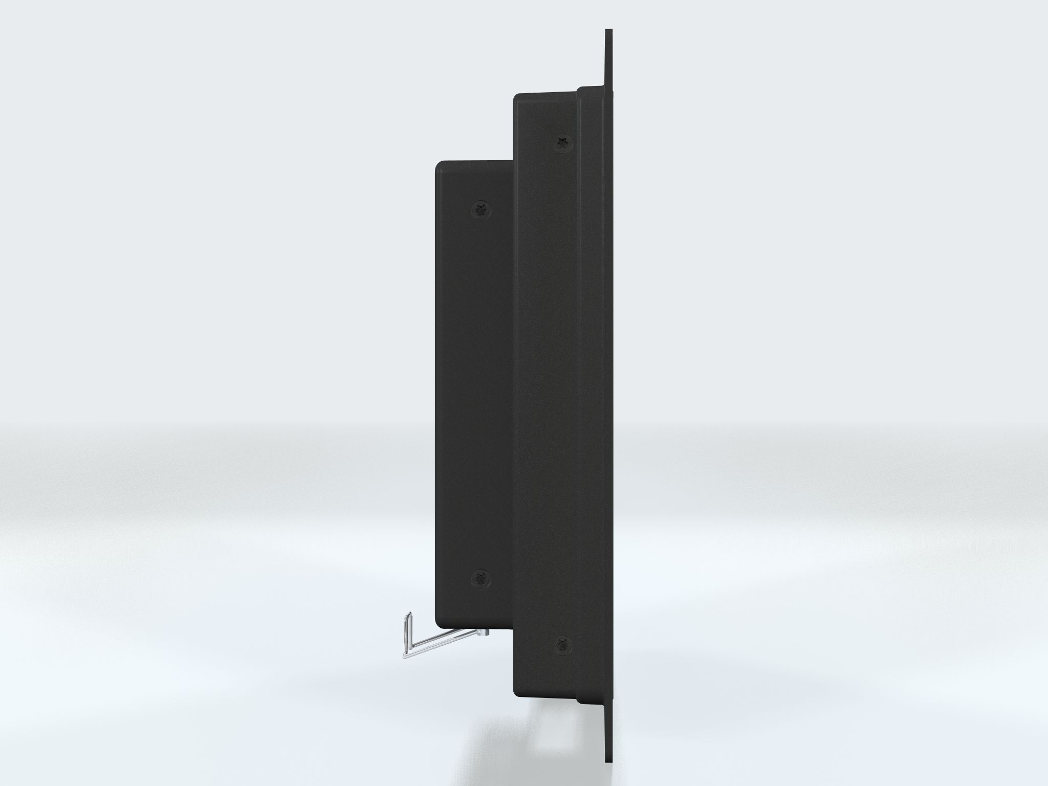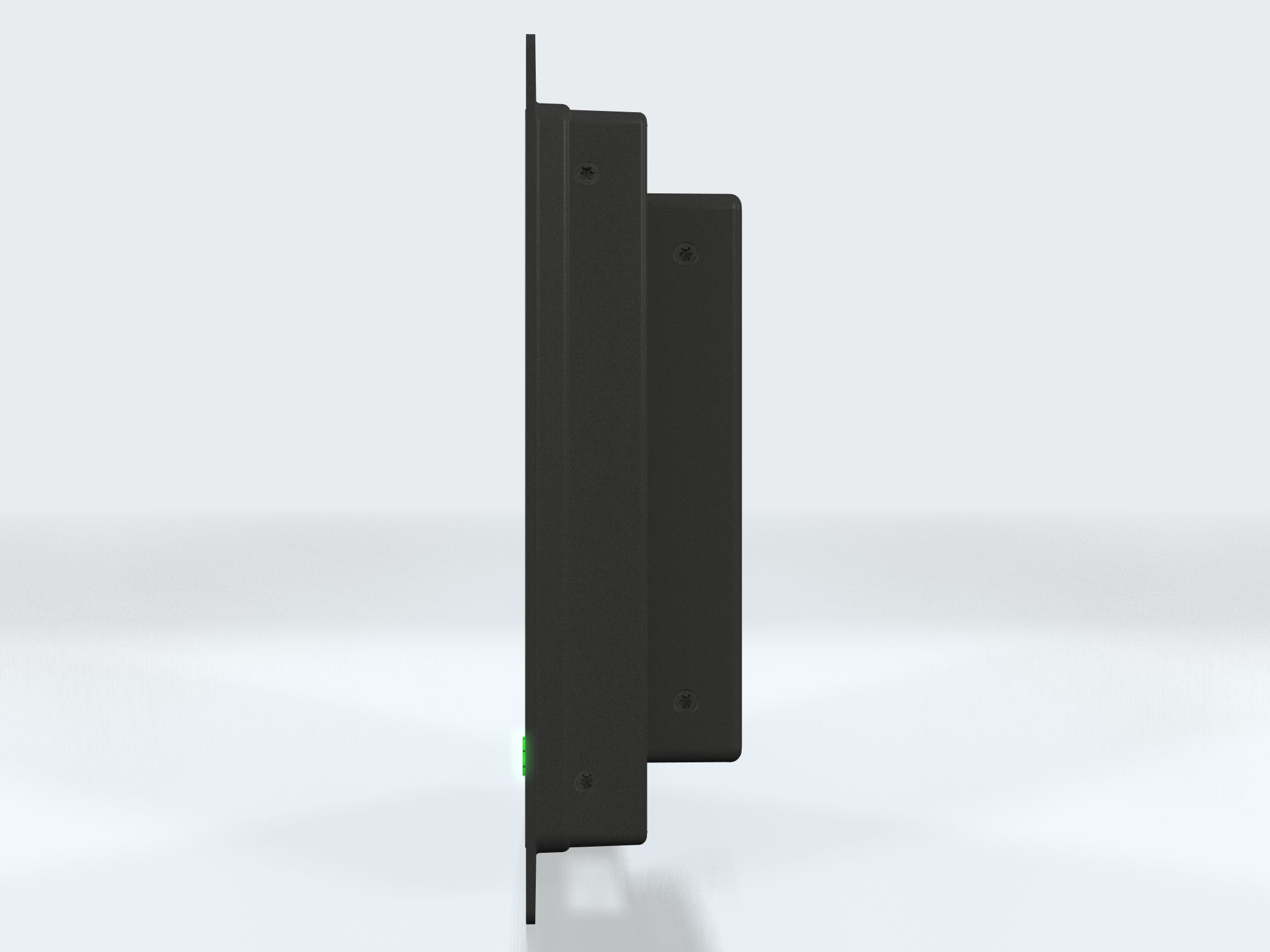Shipped with factory mounted flange as standard (16mm in width). IP22 or IP66 rated (from front) depending on the user control. Console mounting for tight installations. Model secured from front. Visible screws in front. Optical bonding technology is standard which mitigates screen misting and eliminates reflections. Brightness is adjustable from 0 to 100%. Either AC or DC power input.