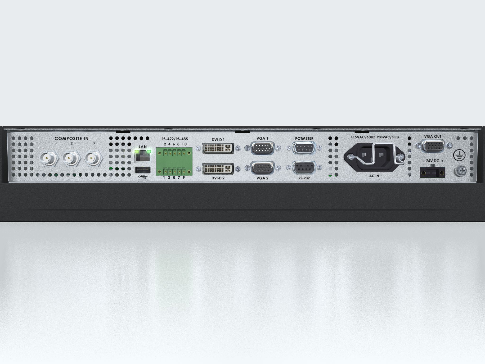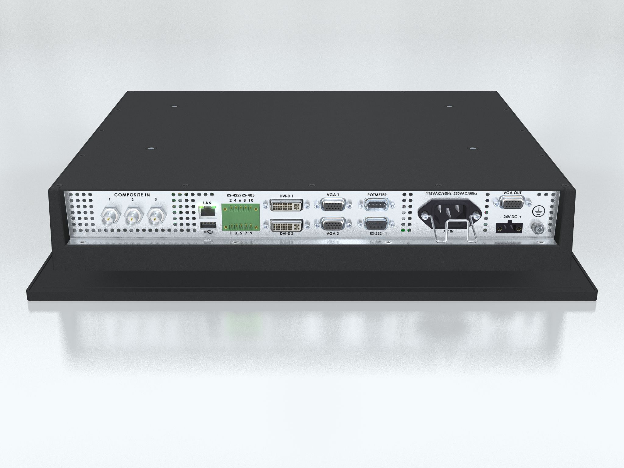 • DVI IN: 2 x DVI-D 24P (female) • VGA IN: 2 x HD D-SUB 15P (female) • Composite Video IN: 3 x BNC (female) • SCOM RS-422/485: 1 x 5-pin Term. Block 3.81, non-isolated+Buzzer • SCOM Ethernet: 1 x RJ45 (female) • SCOM RS-232: 1 x D-SUB 9P (female) non-isolated+Buzzer • VGA OUT: 1 x HD D-SUB 15P (female) • If Touchscreen: 1 x USB Type A (female). Use USB2.0 (<5m) port. • Potmeter: 1 x D-SUB 9P (male), - (Potentiometer IN, +5VDC OUT, BRT +/- IN) • AC Power IN: 1 x Std. IEC inlet • DC Power IN: 1 x 2-pin Terminal Block 5.08 |
