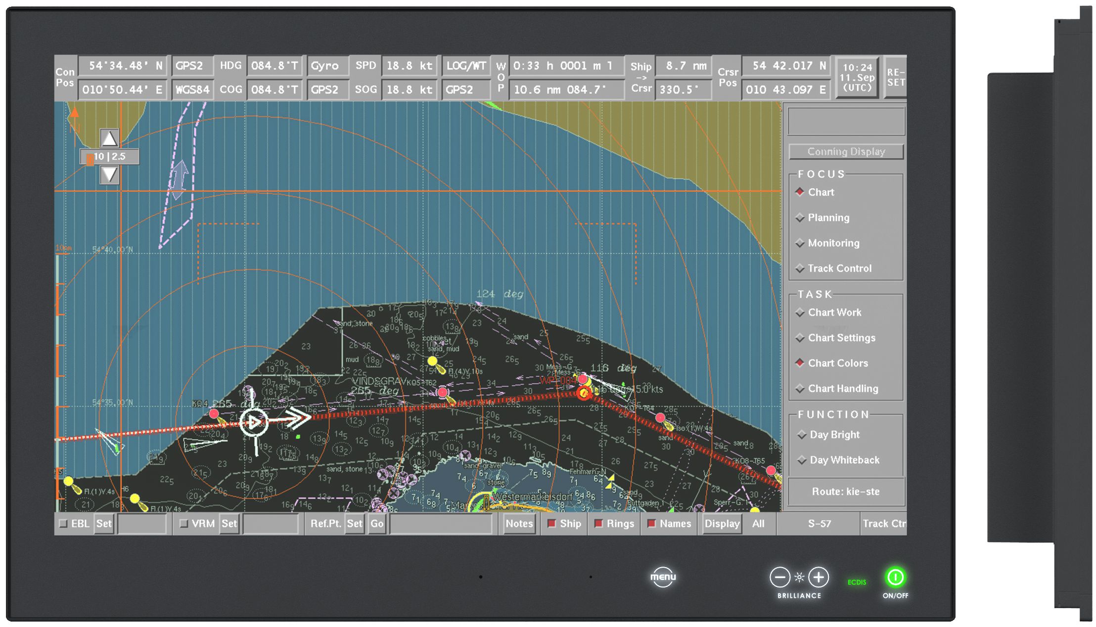 Glass Display Control™ (GDC) IP66 with: Power On/Off, On Screen Display Menu, Brightness Control (-/+), Hotkeys (left/right), Mode Status Indicators (ECDIS, Service), Buzzer (through glass), Light Sensor (behind glass) |