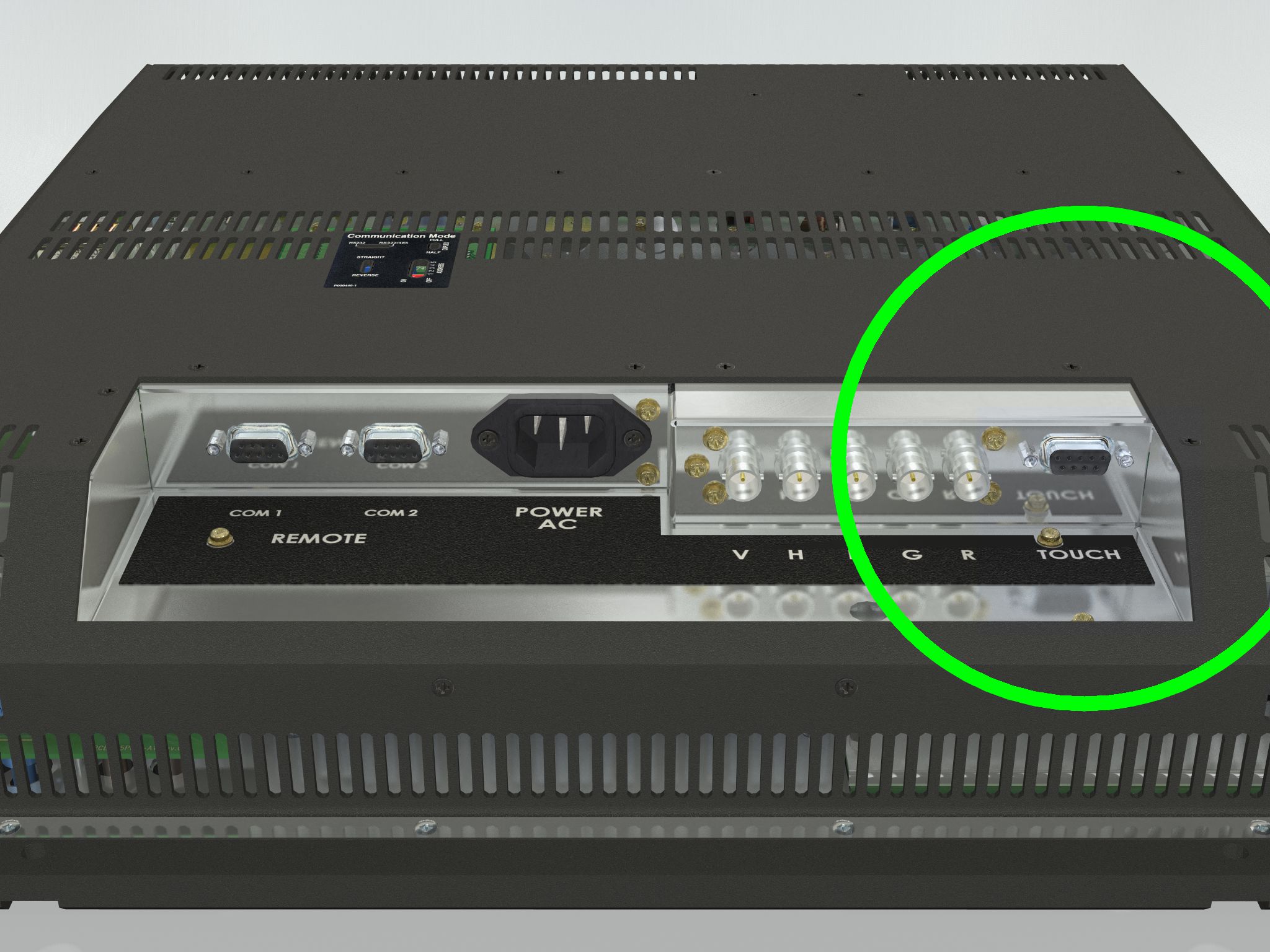 • RGB IN: 5 x BNC Connectors (RGBHV) • Touch Screen: 1 x D-SUB 9P (female) • Serial Remote Control: 2 x D-SUB 9P (female) • AC Power IN: 1 x Std. IEC inlet |