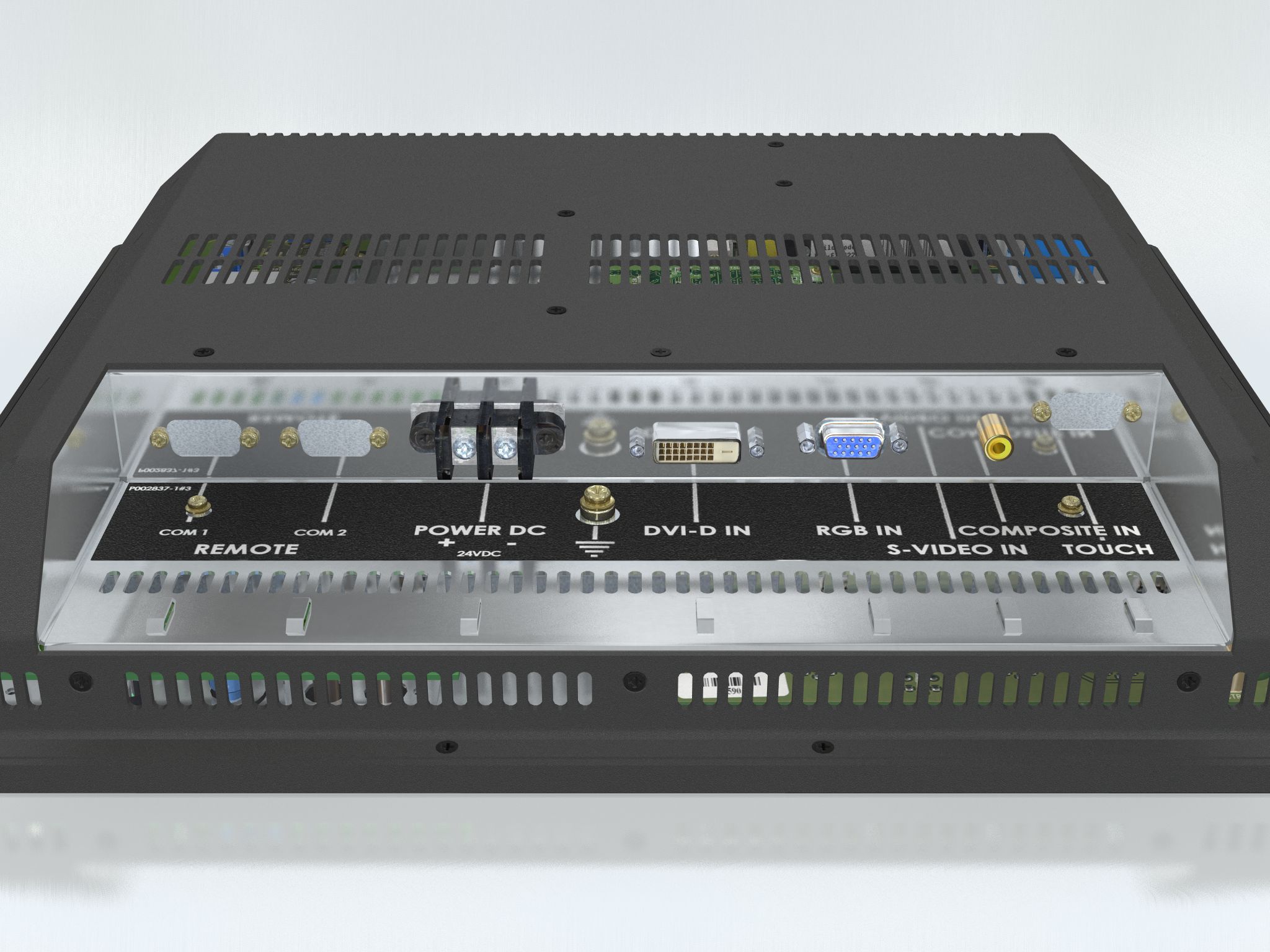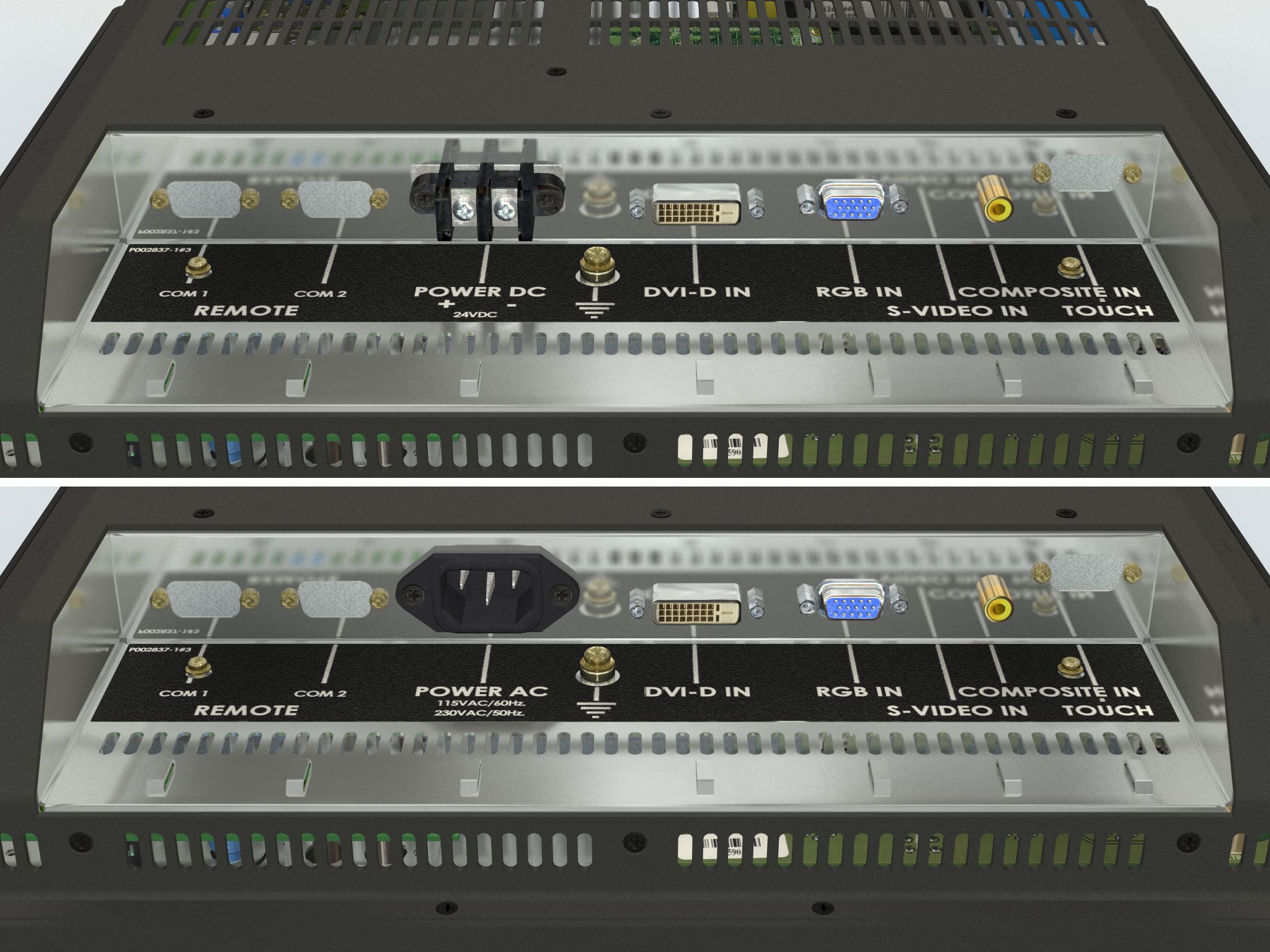 • DVI-I (PC) signal: DVI-I Input 29pin Connector • RGB (PC) signal: 15pin mini D-SUB (female - Input) • Composite Video: RCA Phono plug • S-Video signal: S-Video (SVHS) plug • AC Power signal: Std IEC Inlet Model JH 17T02 MMD-A1 • DC Power signal: Screw terminal Model JH 17T02 MMD-A2 • If Touchscreen: 1 x D-SUB 9P Connector (female) • If Remote Control: 2 x D-SUB 9P Connectors (female) |