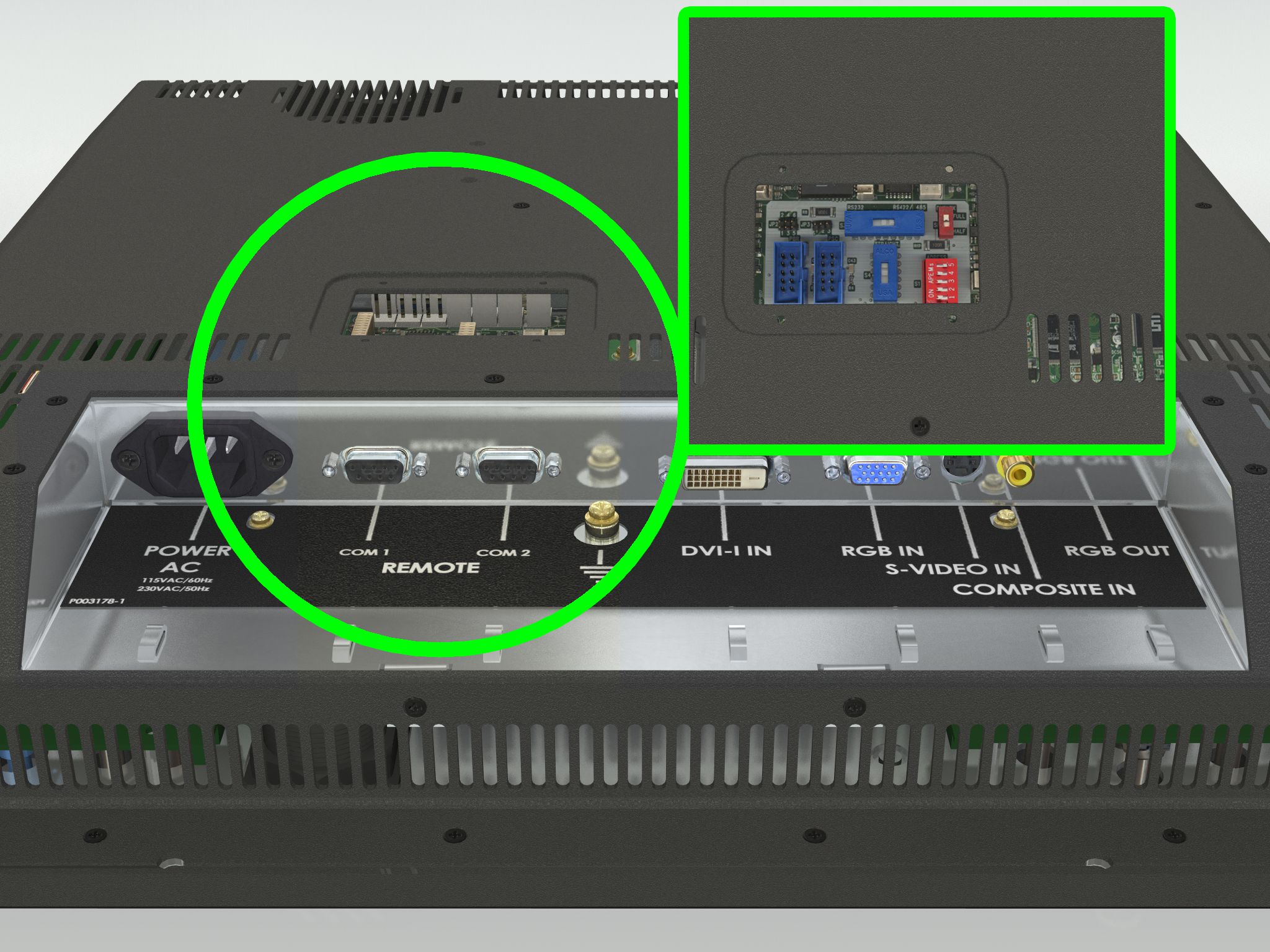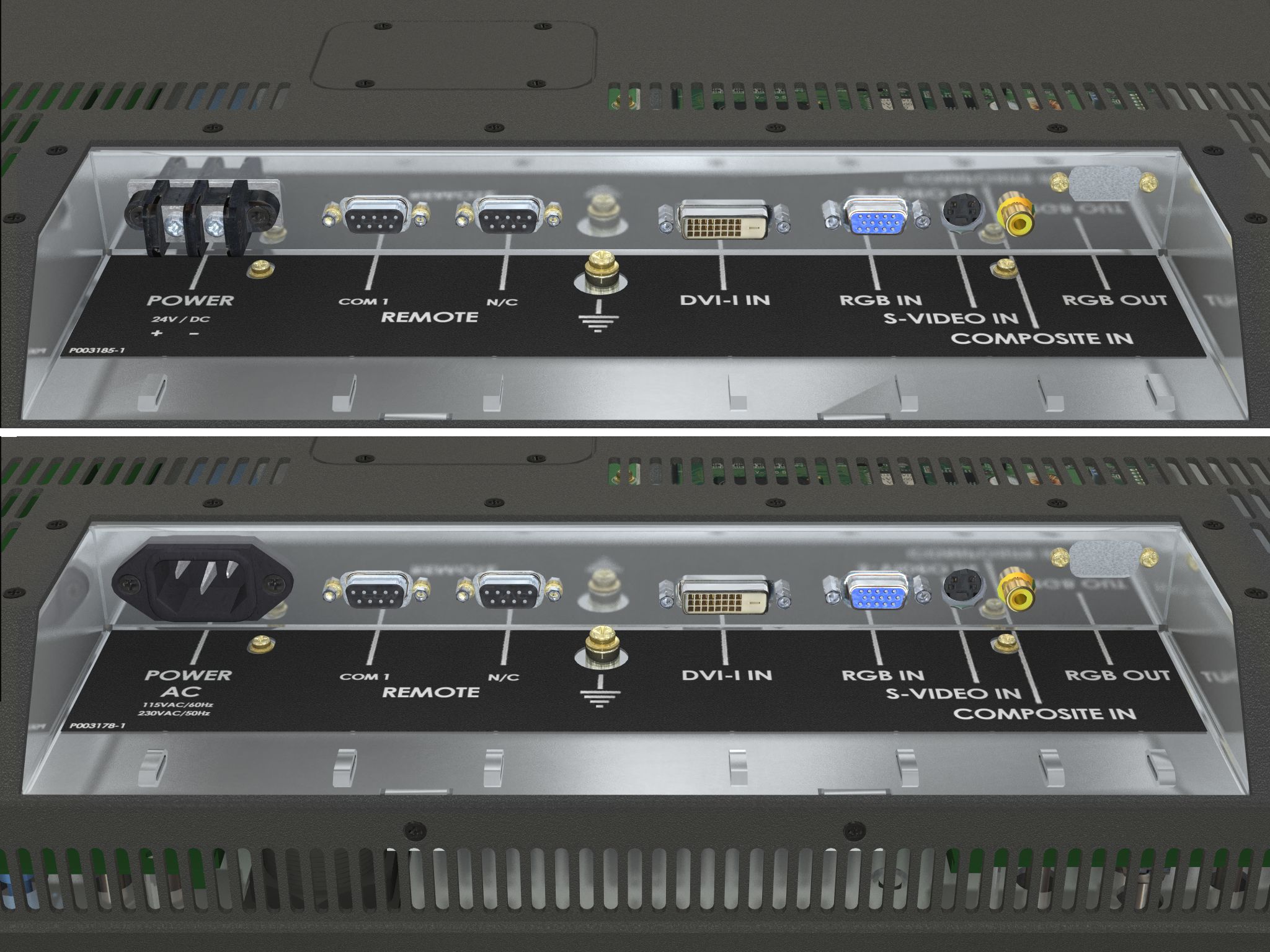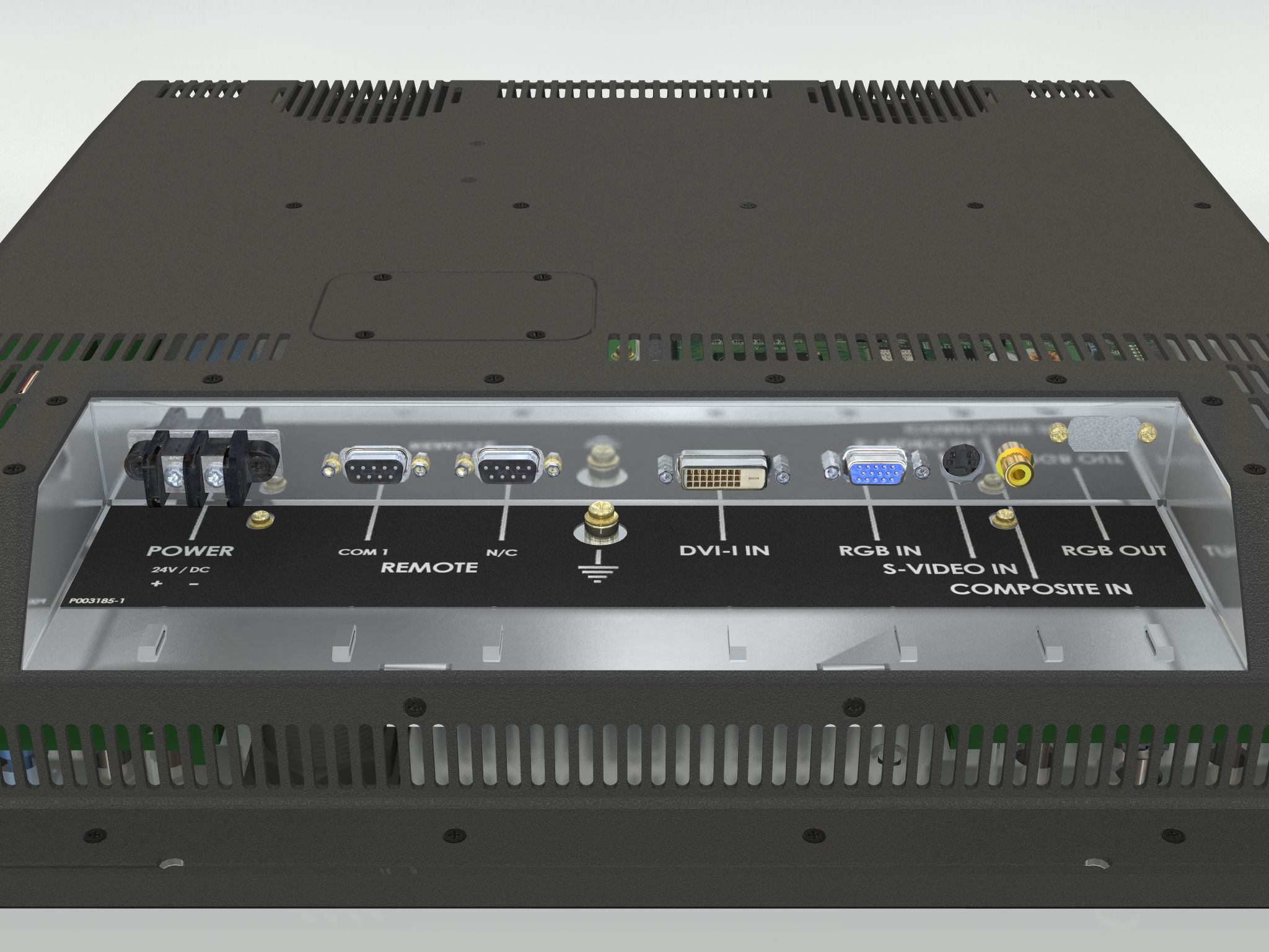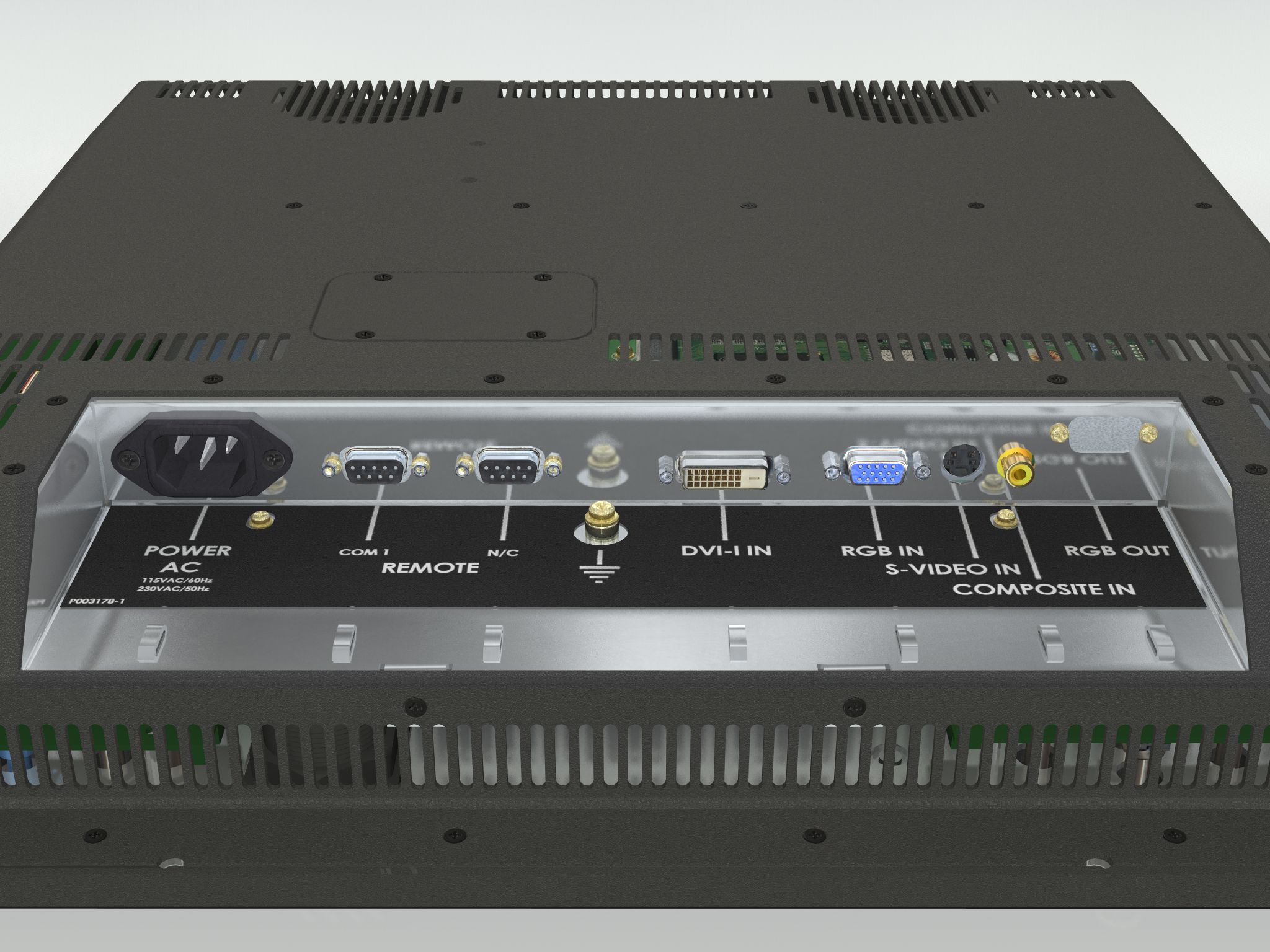 • DVI-D (PC) signal: DVI-D Input 24pin Connector • RGB (PC) signal: 15pin mini D-SUB (female - Input) • Composite Video: RCA Phono plug • S-Video signal: S-Video (SVHS) plug • AC Power signal: Std IEC Inlet Model JH 20T06 MMD-A1 • DC Power signal: Screw terminal Model JH 20T06 MMD-A2 • If Touchscreen: 1 x D-SUB 9P Connector (female) • If Remote Control: 2 x D-SUB 9P Connectors (female) |