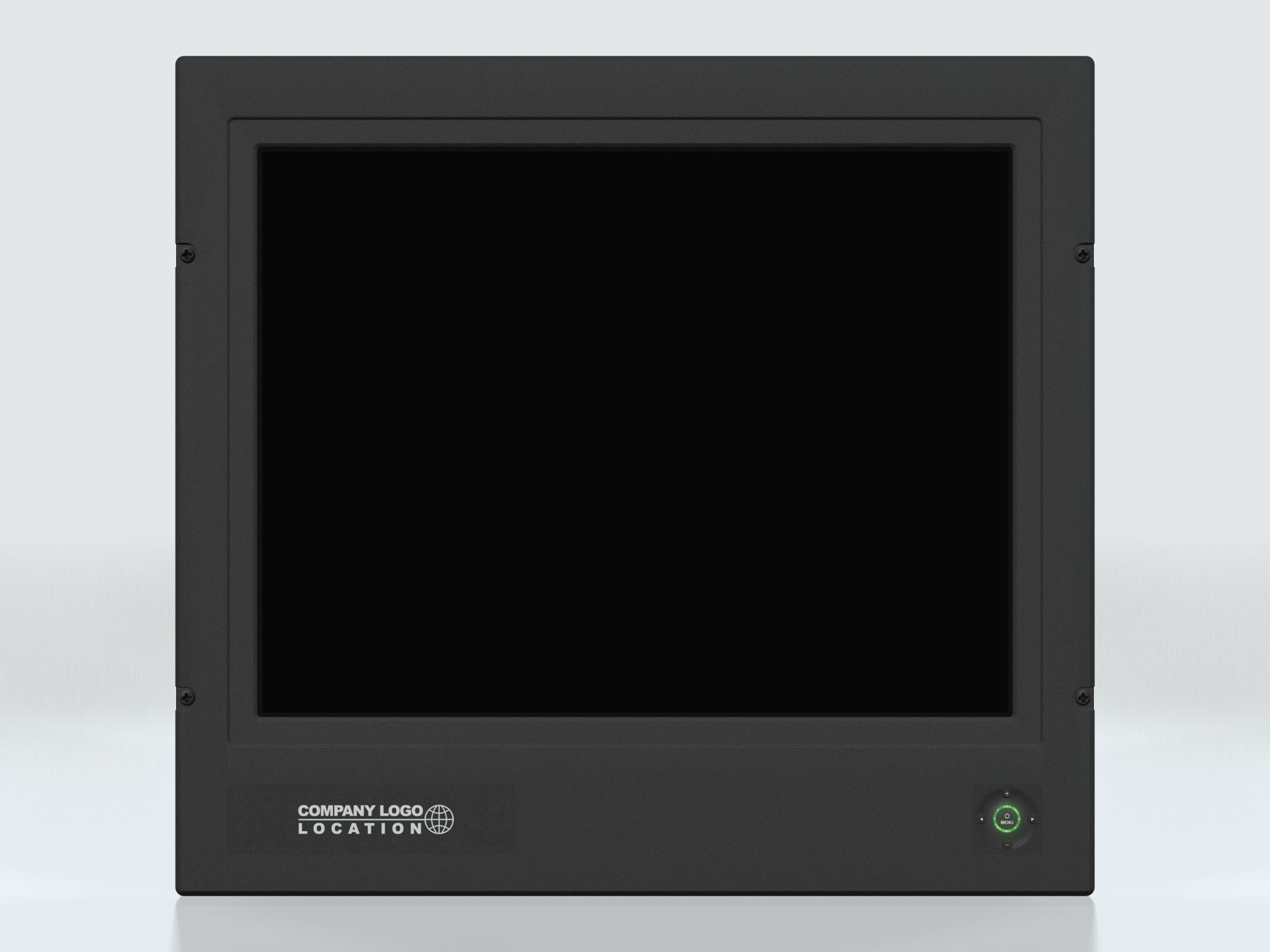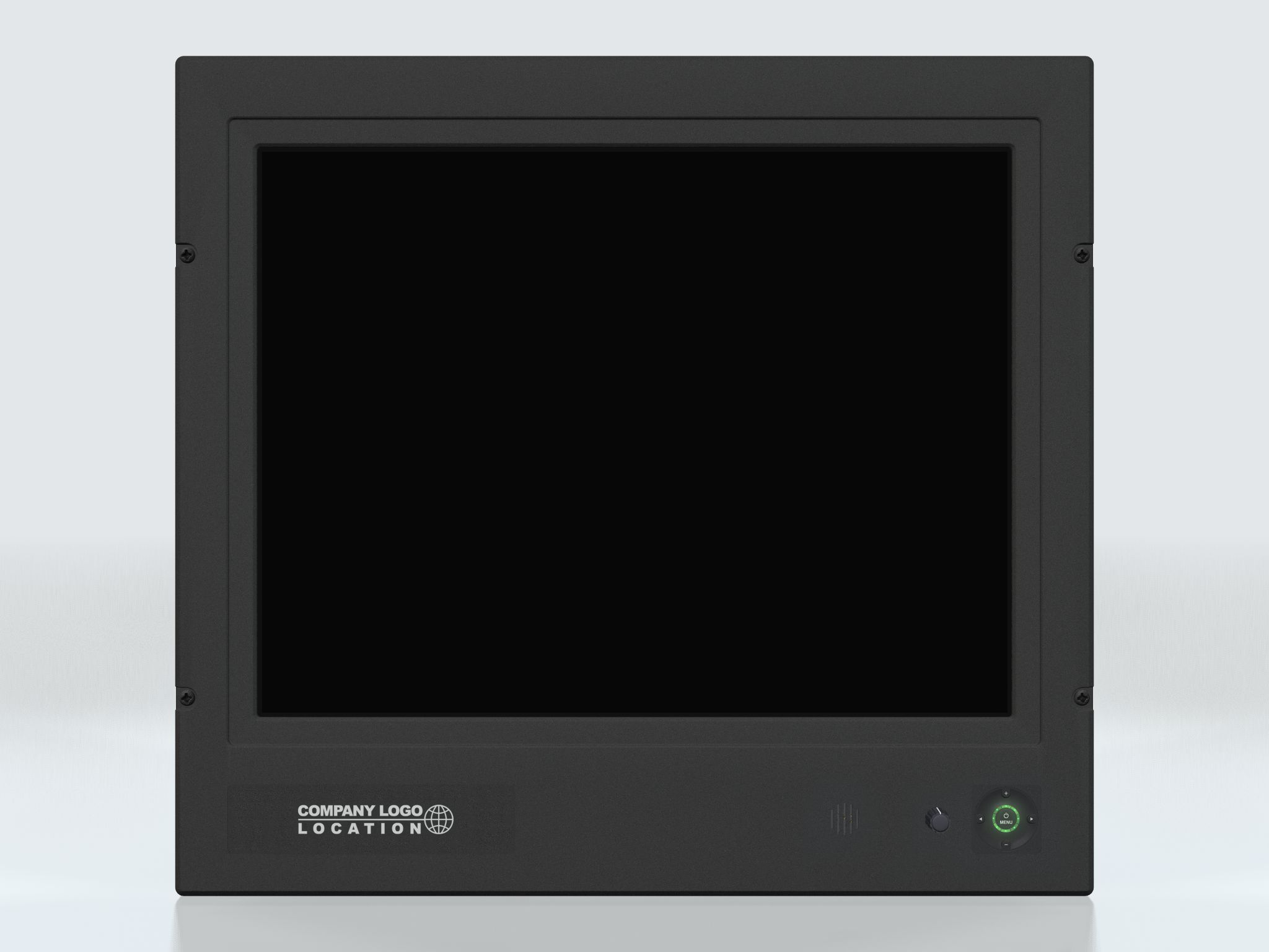 On front bezel - Keypad control (IP66) yyy-yyAy models: • Power On/Off and On Screen Display Menu (push button) • Brightness Control (up/down - push buttons) • Hotkeys (left/right - push buttons) • Mode Status Red/Green Illuminated LED-Ring Indicator On front bezel - Potmeter control (IP66) yyy-yyBy models: • Power On/Off and On Screen Display Menu (push button) • Brightness Control (rotary control) • Hotkeys (left/right - push buttons) • Mode Status Red/Green Illuminated LED-Ring Indicator • Speaker / Buzzer |