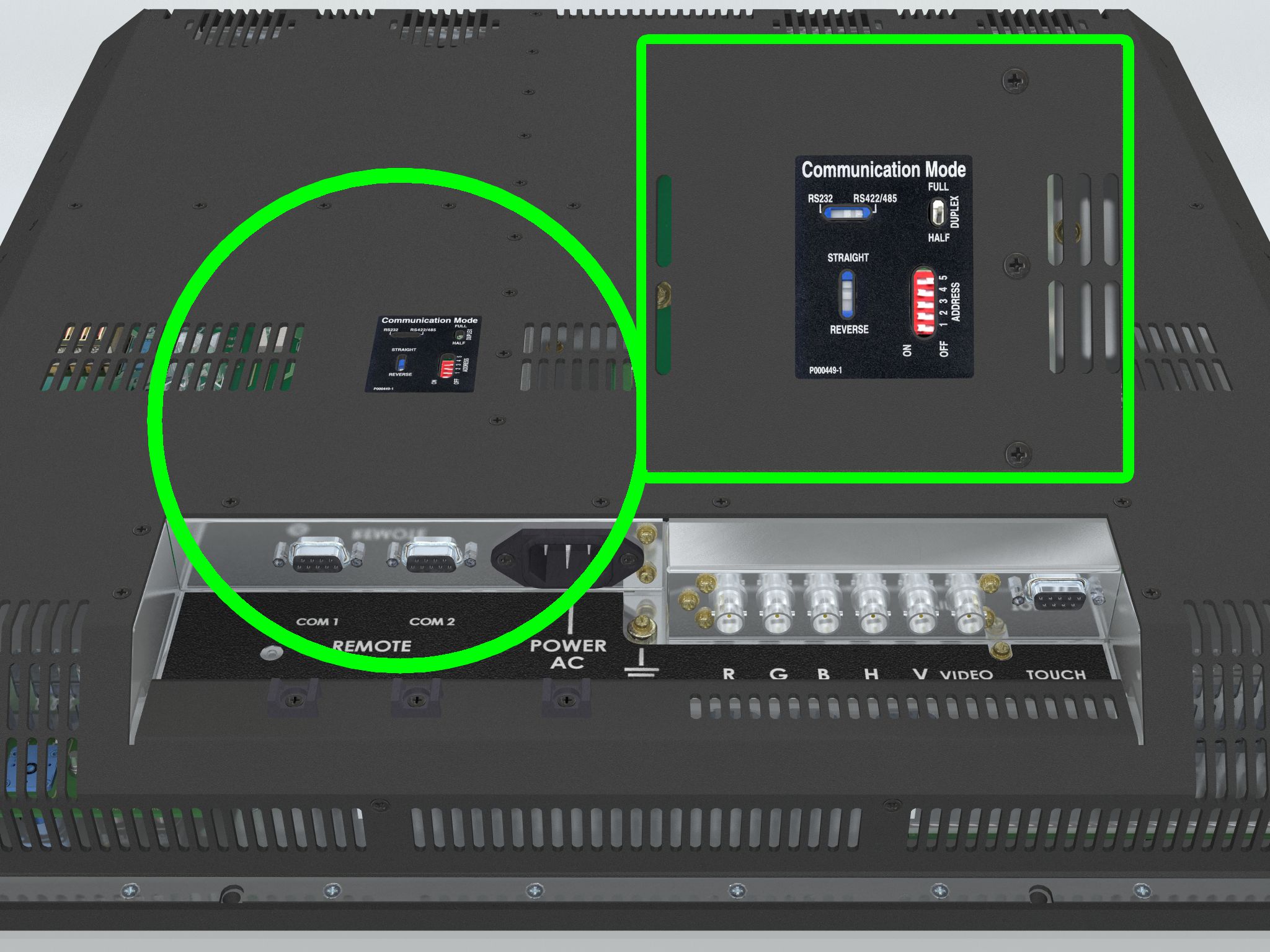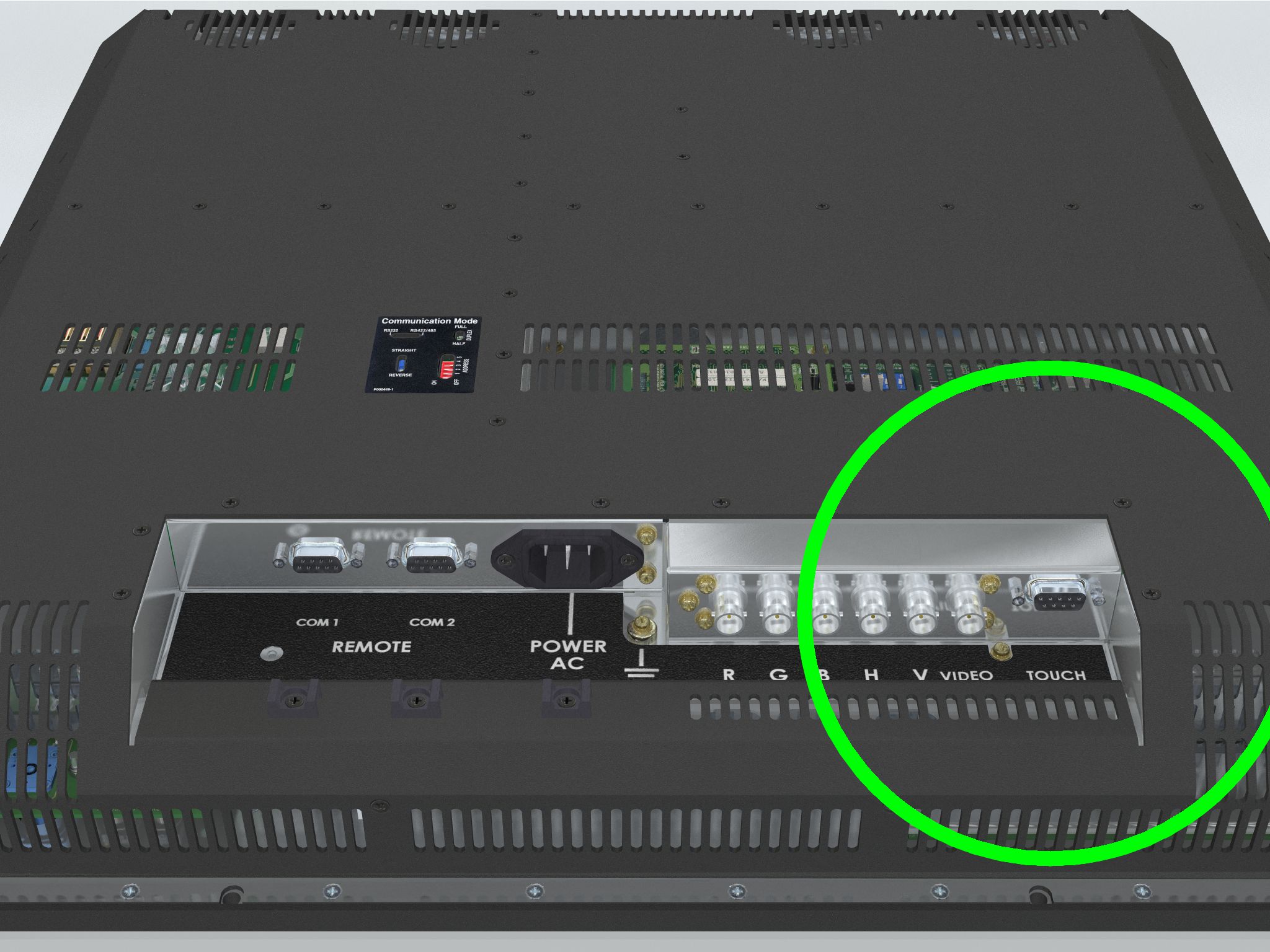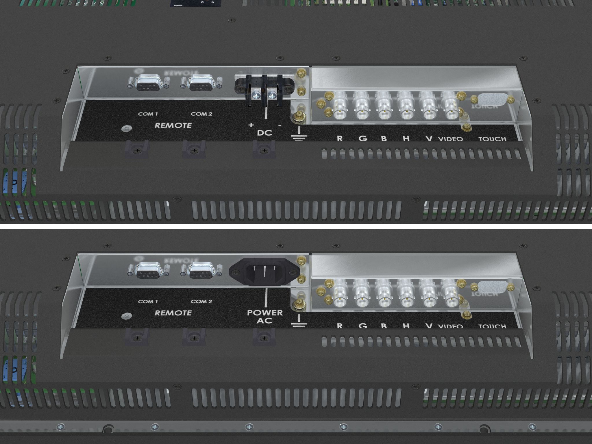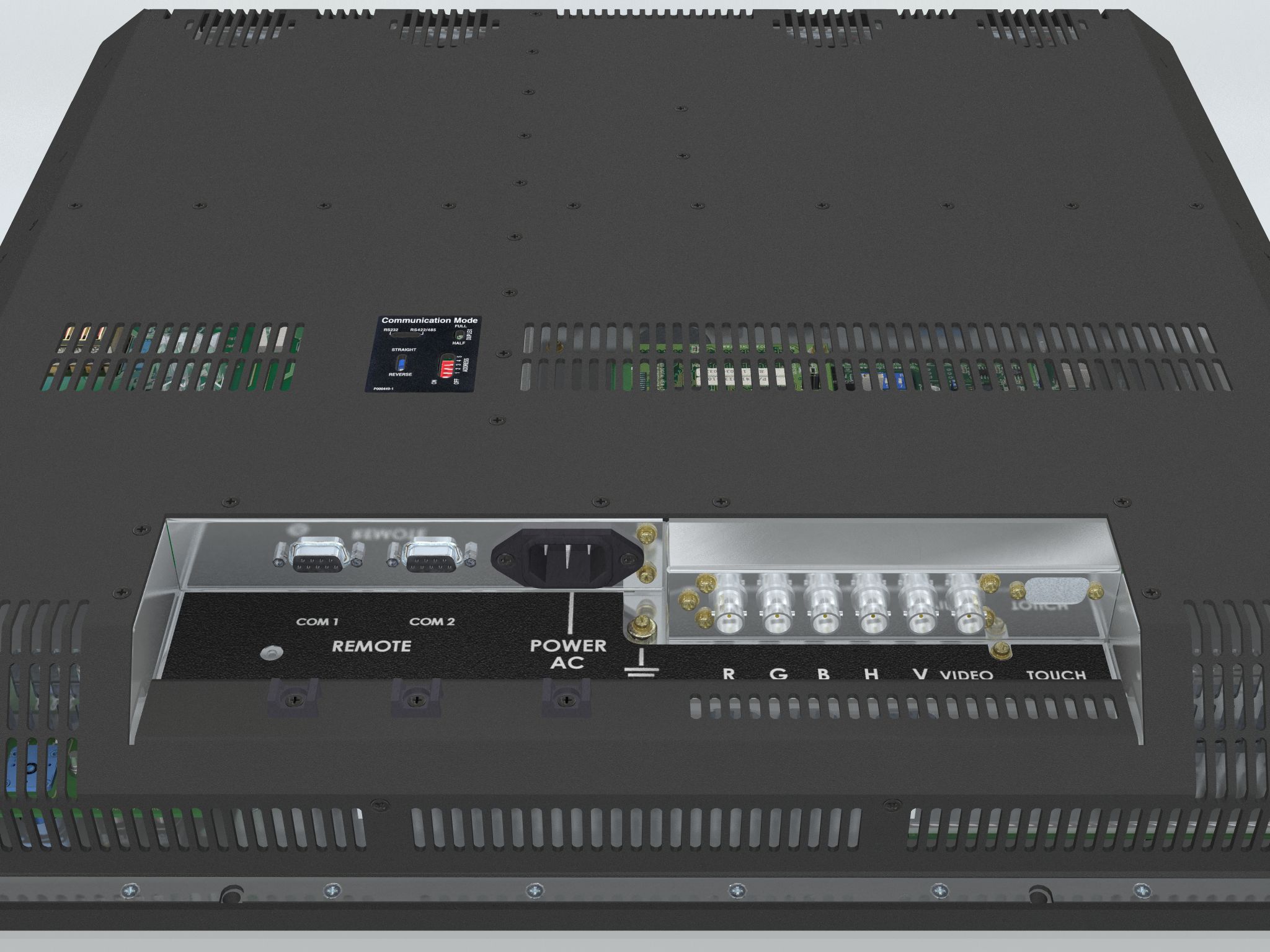• RGB (PC) signal: 5 x BNC Connectors (RGBHV) • Composite Video: 1 x BNC Connector • AC Power signal: Std IEC Inlet - Model JH 23T02 MIL-A1 • If Touchscreen: 1 x D-SUB 9P Connector (female) • If Remote Control: 2 x D-SUB 9P Connectors (female) |