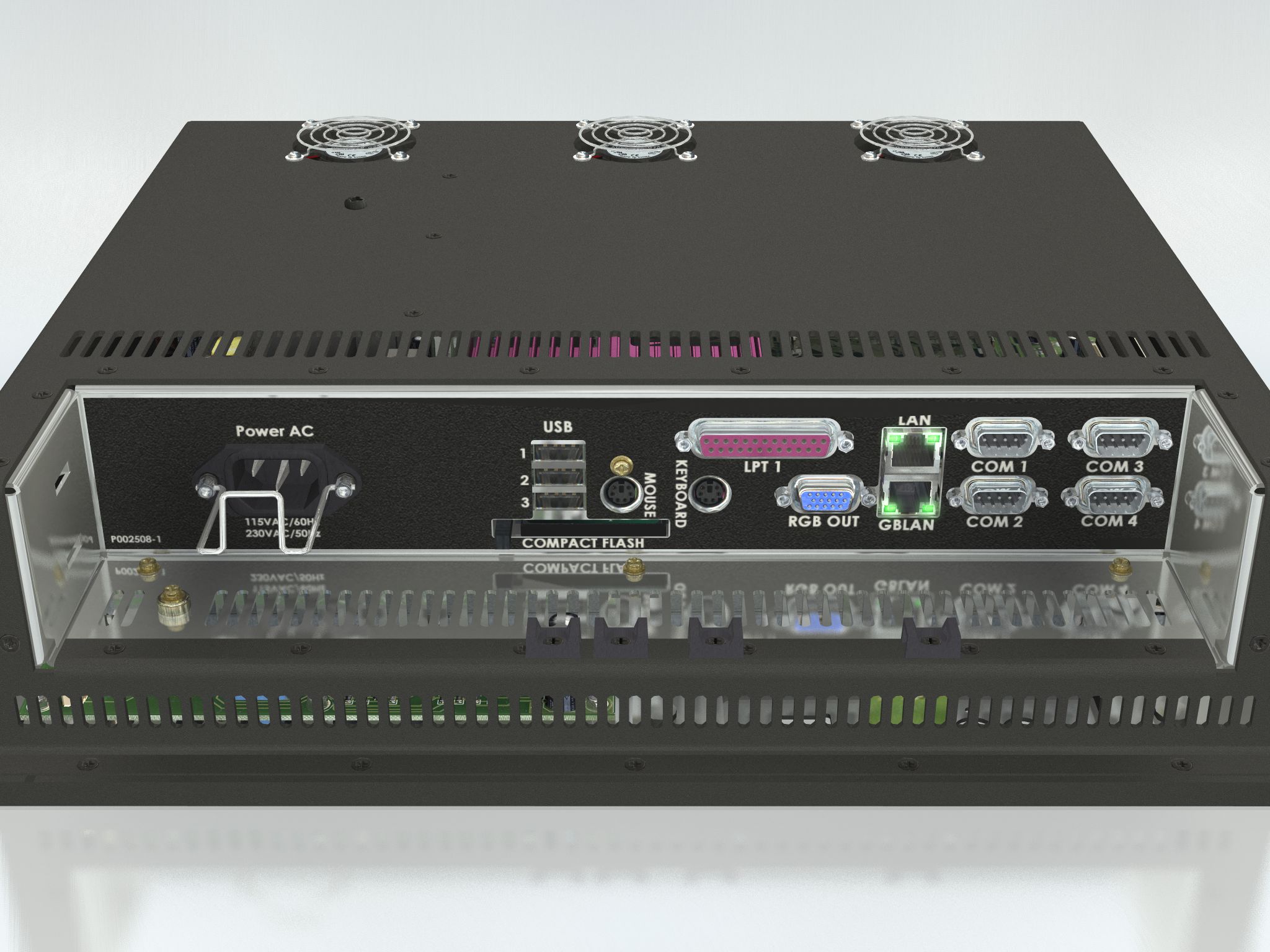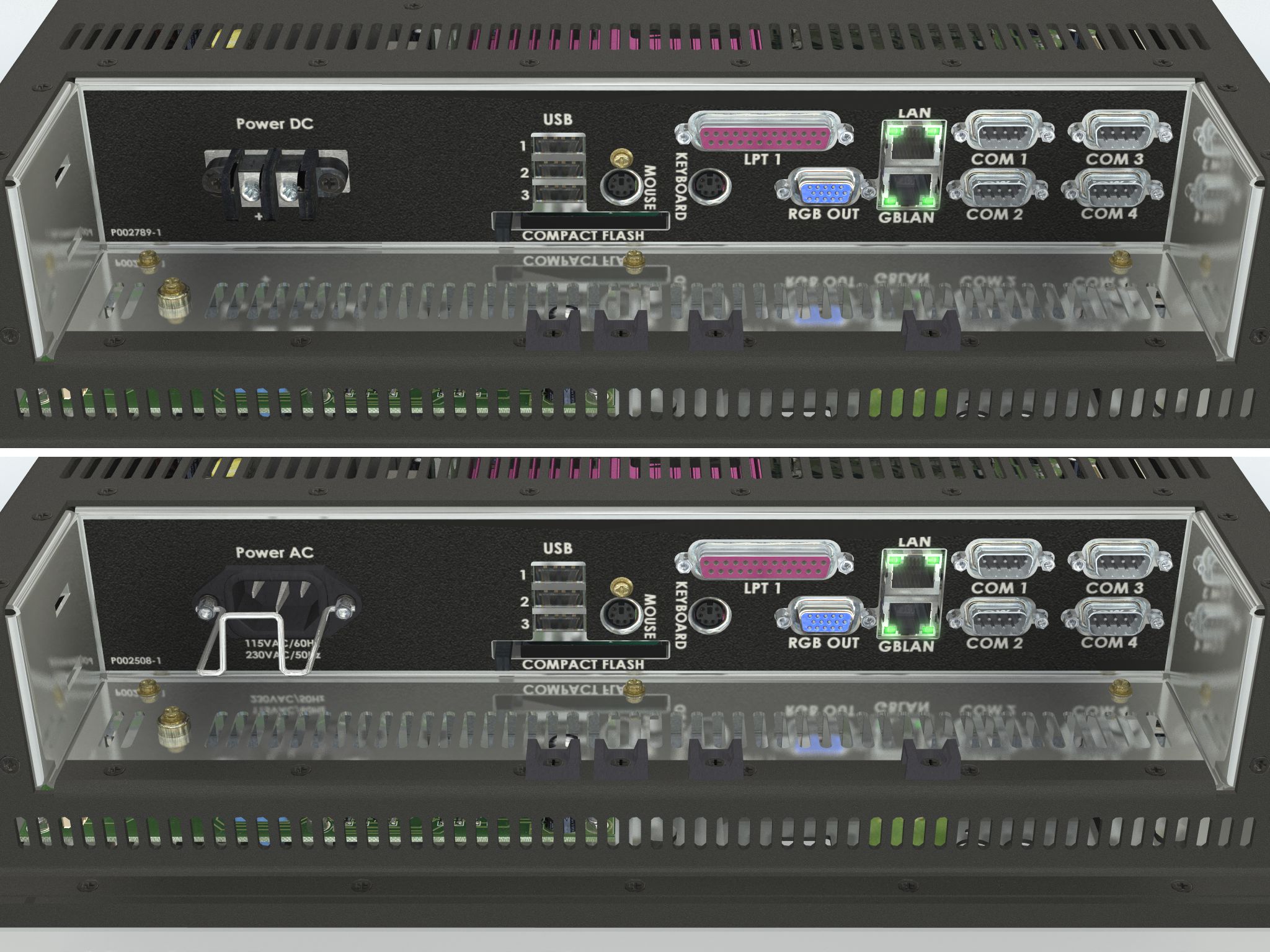 • Ethernet GBLAN 10/100Mbps: 2 x RJ45 • PC/104 Slot: 1 x internal • Keyboard: 1 x PS/2 • Mouse: 1 x PS/2 • Compact Flash: 1 x CF Socket with Eject (Type I&II) • COM: 4 x DB9 (RS-232/422/485) - Fully isolated is RS422/485 mode • LPT/Parallel: 1 x DB25F Bi-Directional/ECP/EPP • USB: 4 x USB2.0 compliant (1 x front, 3 x back) • If AC Power IN: Std IEC inlet • If DC Power IN: DC Screw terminal • RGB Out: 1 x HD-15F • TV Out: Composite RCA (depends on model) • Line In/Out: 3.5mm mini jack (depends on model) • Mic In: 3.5mm mini jack (depends on model) |