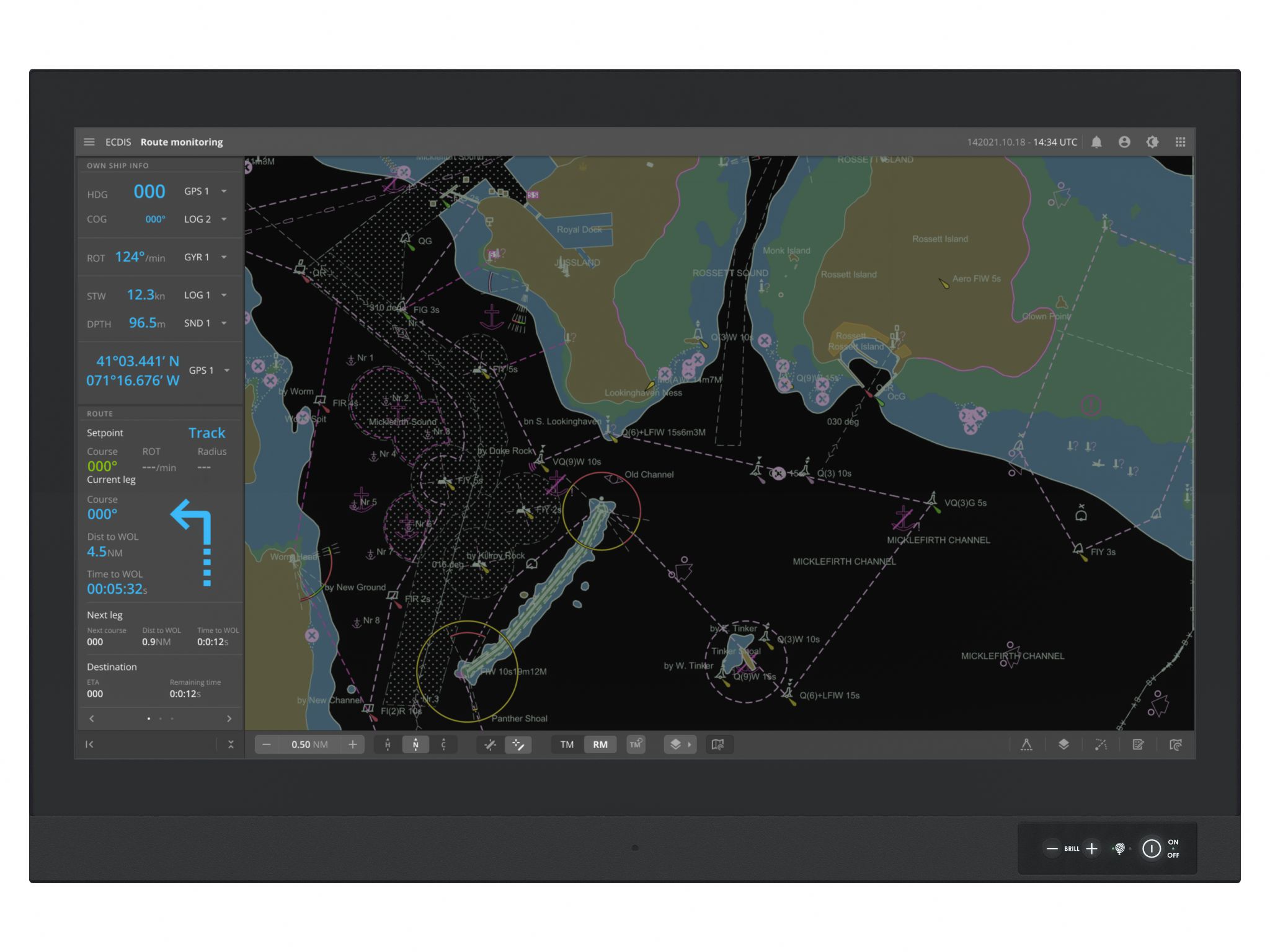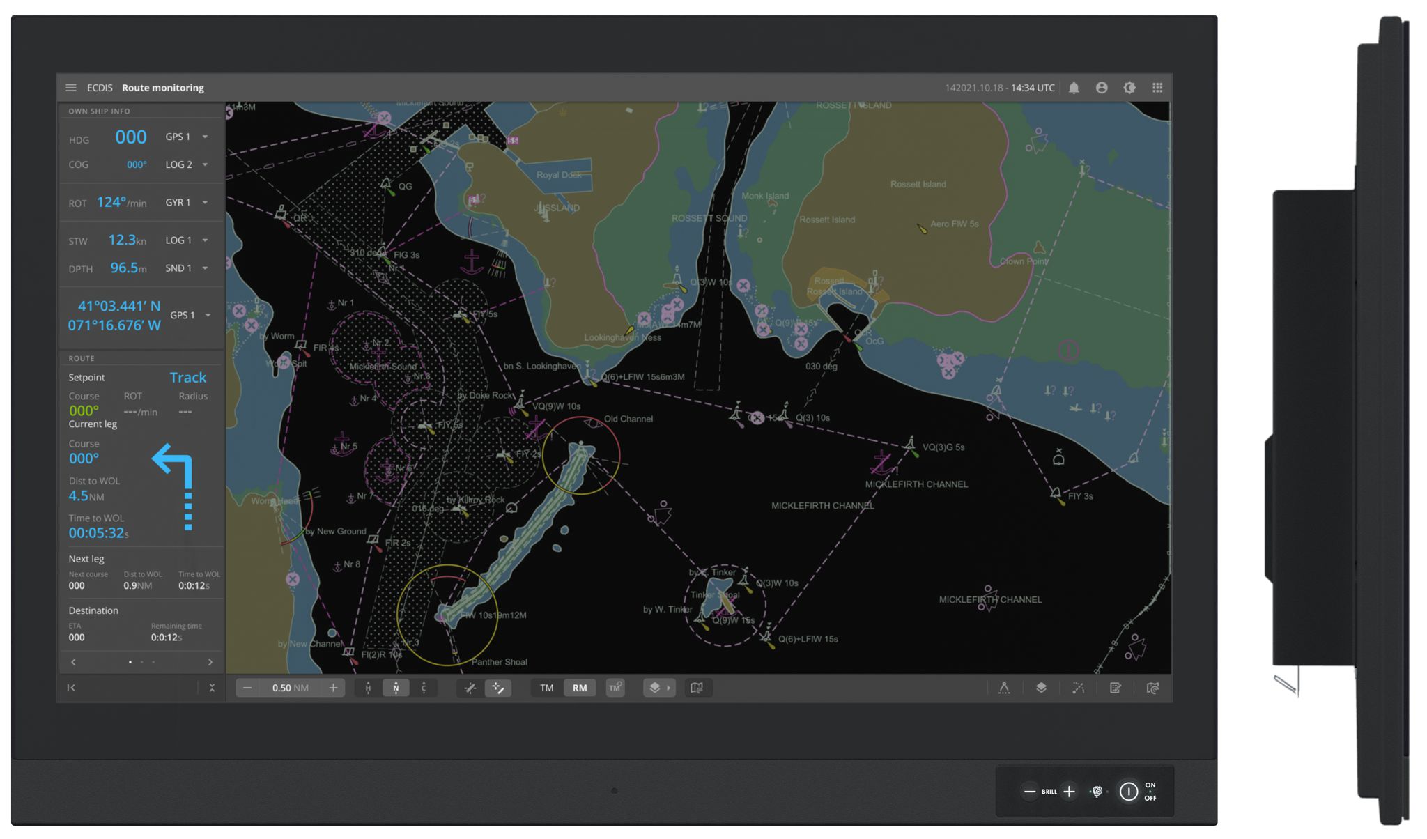 On Front Bezel (IP66), Tactile buttons: Power On/Off, Brightness Control (-/+), Power LED, ECDIS LED, Buzzer (75-85dB), Light Sensor |
