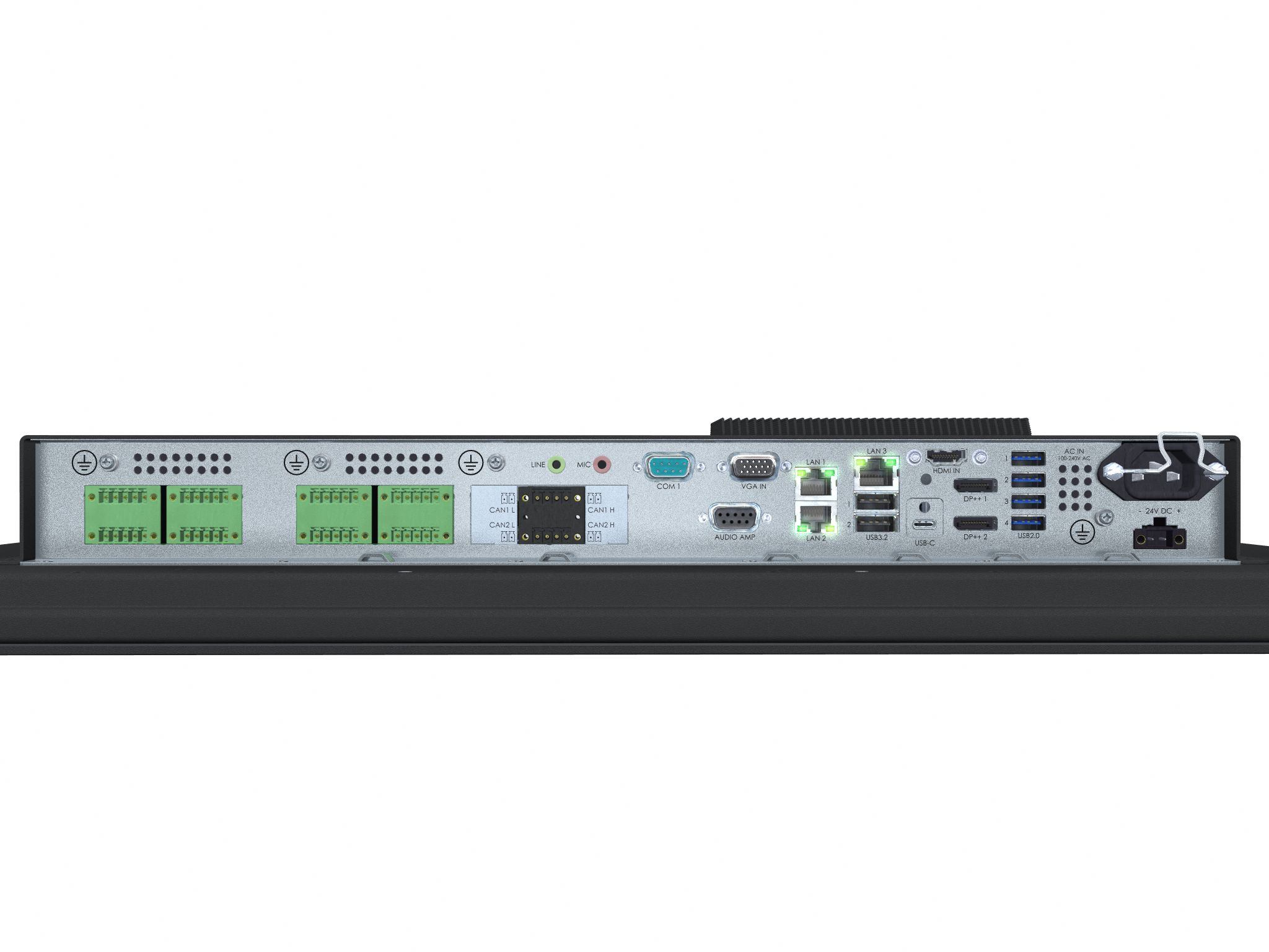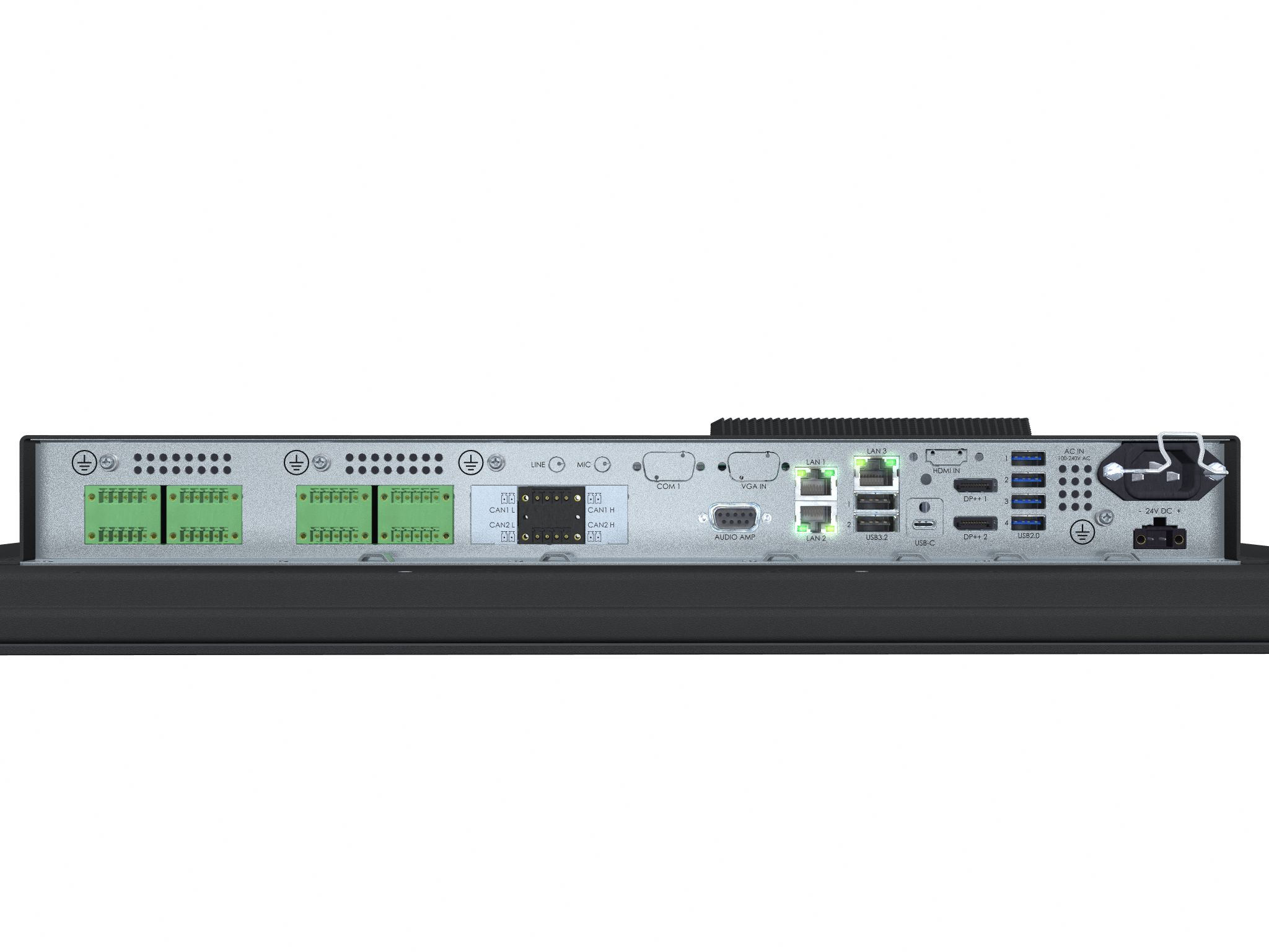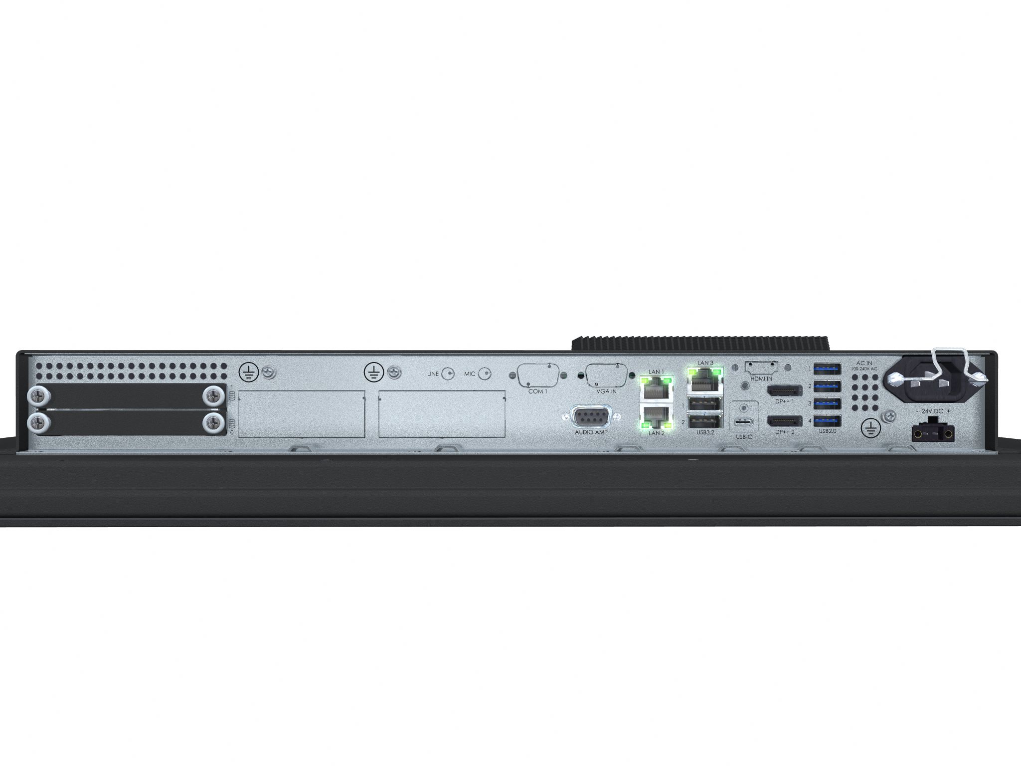 • USB-C: 1 x USB-C DP ALT mode, PD/DP (60W) • DP++ 1.2 OUT: 2 x DisplayPort Female (Dual-Mode DP++) • USB2.0 (<5m): 4 x USB Type A (4-pin) • USB3.0 (<3m): 2 x USB Type A (9-pin) • Ethernet GBLan: 3 x RJ-45 • Amp Audio: 1 x DB9 Female 2W@70°C • If SSD Trays: 2 x 2.5" Sized Tray/Bay (Factory option) • AC Power IN: 1 x Std IEC inlet • if DC Power IN: 1 x 2-pin Terminal Block 5.08 |
