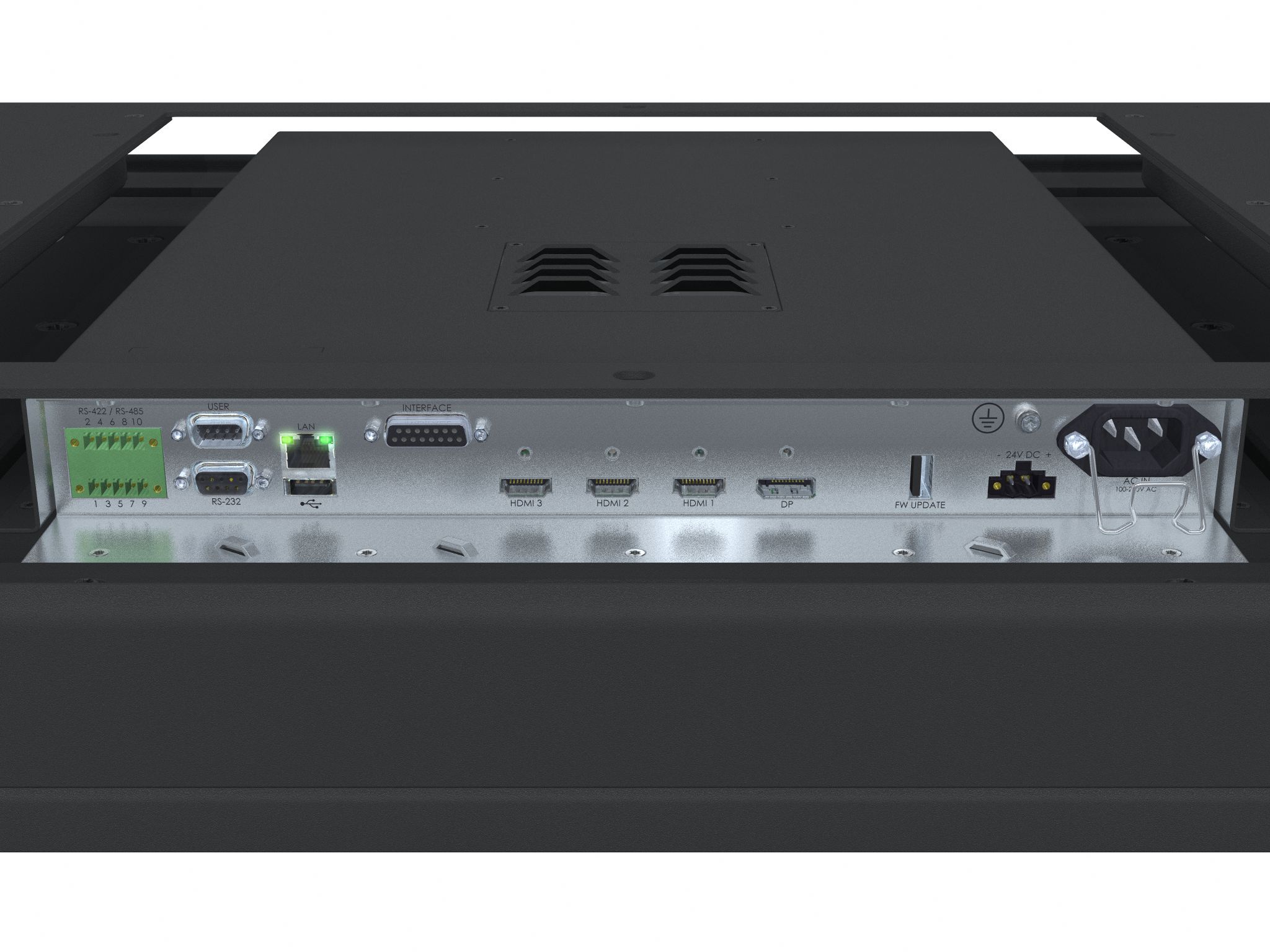 • HDMI 1.4 Input: 2 x 19p HDMI (female) - Max 3840x2160@30Hz • HDMI 2.0 Input: 1 x 19p HDMI (female) - Max 3840x2160@60Hz • DP 1.2 Input: 1 x 20p DisplayPort (female) - Max 3840x2160@60Hz, Note: Max Cable length: <3m • SCOM RS-422/485: 1 x 5-pin Terminal Block 3.81 non-isolated + Buzzer • SCOM+Touch: 1 x USB TYPE A Connector (female) • SCOM Ethernet: 1 x RJ45 Connector for Remote Control • SCOM RS-232: 1 x 9p D-SUB (female) non-isolated • User Interface: 1 x 9p D-SUB (male) - Potentiometer Analog Input, User Brightness (BRT), I2C and +5VDC & 12VDC OUT • SW Interface: 1 x USB TYPE A (female) for Firmware Update • TDC Interface: 1 x 15p D-SUB (male) for HD TDCMVD KIT-A1 • AC Power IN: 1 x Std IEC Inlet • DC Power IN: 1 x 2-pin Terminal Block 5.08 |
