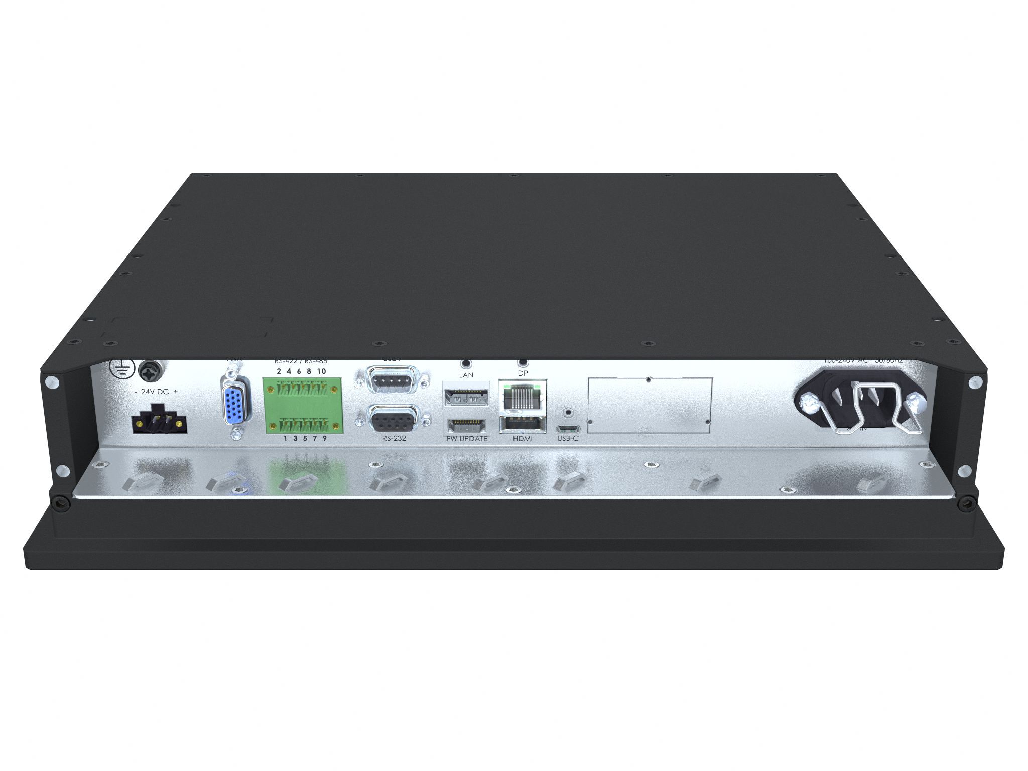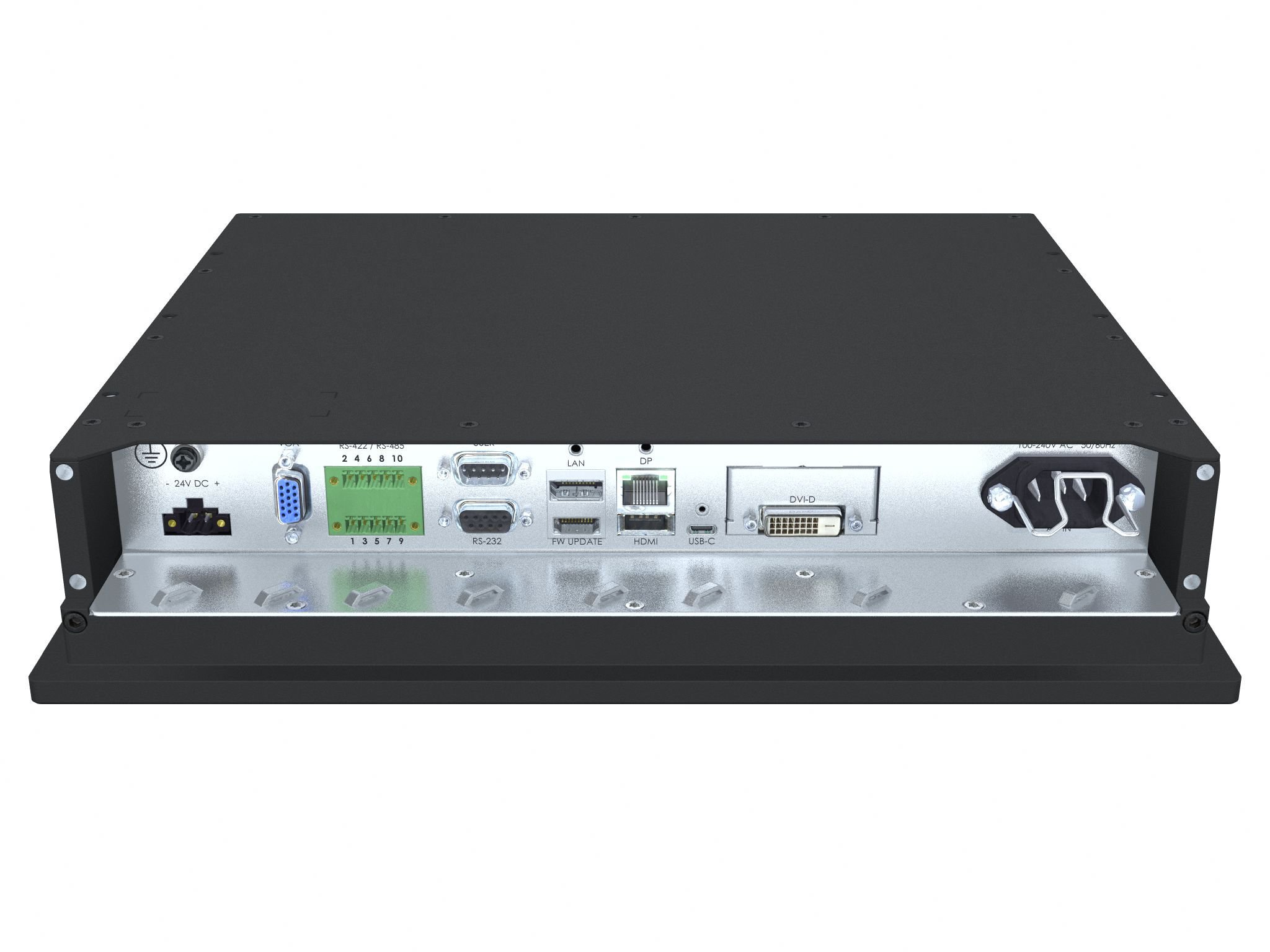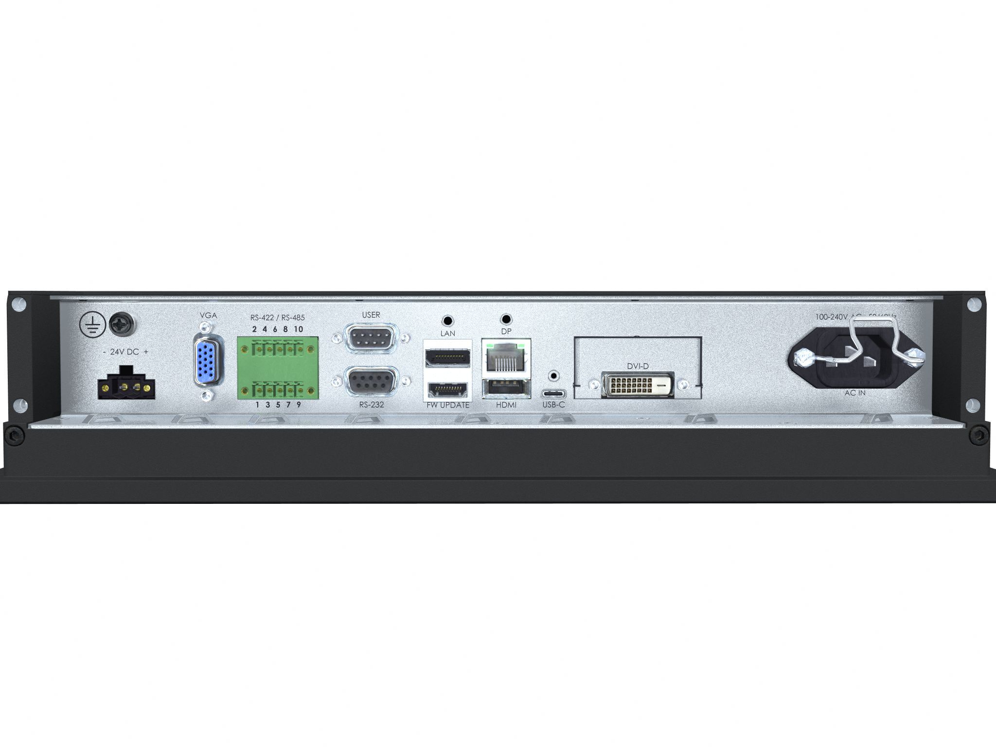 • DP 1.4 IN: 1 x 20p DisplayPort (female)* • HDMI 2.0 IN: 1 x 19p HDMI (female)* • USB-C: 1 x USB-C Female with DP 1.2 IN and USB2.0 (SCOM, touch and uC Firmware Update)* • VGA/RGB IN: 1 x 15p D-SUB (female)* • SCOM RS-422/485: 2 x 5-pin Terminal Block 3.81, non-isolated+Buzzer • SCOM Ethernet: 1 x RJ45 Connector • SCOM RS-232: 1 x 9p D-SUB (female) • VS Firmware Update: 1 x USB TYPE A Connector (female) • Potmeter/User: 1 x 9p D-SUB (male), (Potentiometer IN, +5VDC OUT, BRT +/- IN) • AC Power IN: 1 x Std IEC Inlet • DC Power IN: 1 x 2-pin Terminal Block 5.08 Note: Max Cable length: <2m* |